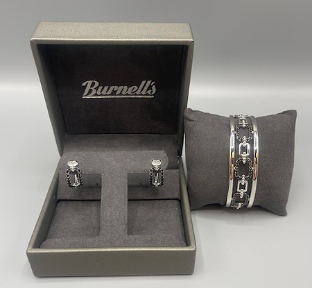 Discover the elegance gifted by Burnell's jewelry store with this listing featuring two stunning pieces of craftsmanship. First, indulge in the exquisite 92.5% sterling silver earrings adorned with .11 ctw black spinel designed as captivating link hoops that will elevate any outfit. Complementing the earrings is a beautifully crafted sterling silver bracelet, featuring a wide cut beaded design and sparkling black spinel coming in at 1.05 ctw. Don’t miss your chance own these exquisite pieces that blend sophistication with timeless charm!